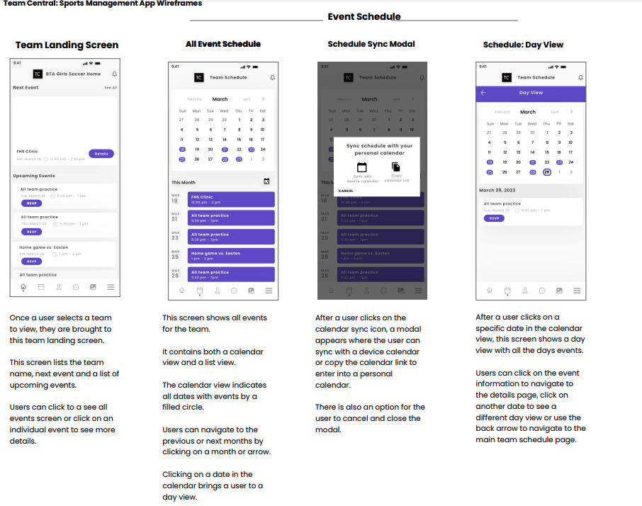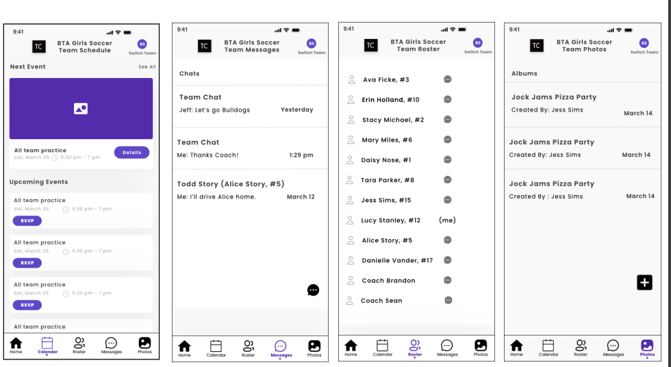 Create a prototype for a sports team management application that can be downloaded on a smartphone through Google Play for Android devices and the App Store for Apple devices.